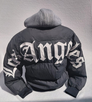 De jas is uitgevoerd in een diepzwarte kleur met opvallende Los Angeles-letters op de rug en een stijlvolle LA-logo patch op de borst. De grijze capuchon met koordsluiting geeft de jas een sportieve en casual look, perfect voor dagelijks gebruik.
